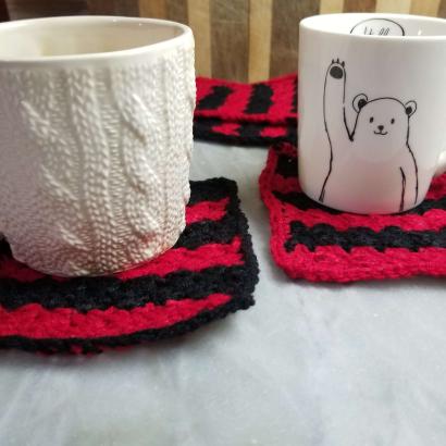 Cheering on your city’s team is a blast in person and at home! These coasters, named for everyone’s favourite team, since our teams are loved by our whole city, Heart of the City, is a coaster pattern for cheering your team on from home. A very simple stitch pattern in two colours, these coasters work up fast and are addictive to make!